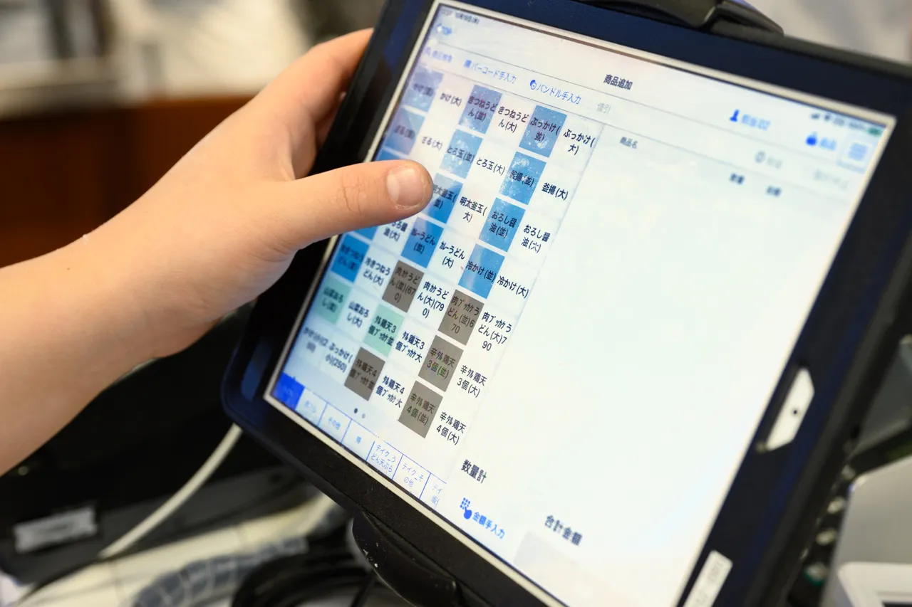 ですが、2年前に新しいiPadのPOSレジが2台導入されてから明らかに操作性が上がりました。お客様のトレーに置かれた商品を見て、レジに打ち込んでいくのですが、新しいPOSレジは「うどん」「天ぷら」などにカテゴライズされているので、タップすればカテゴリー別に表示され、すぐに打ち込むことができます。iPadで画面も大きく、可動域も広いため、高さや距離もスタッフが扱いやすいように自由に調整できます。商品の並びも自分たちが操作しやすいように変更できるのもメリットです。トレーニングを行う際も持ち運びが可能なため、研修しやすくなりました。