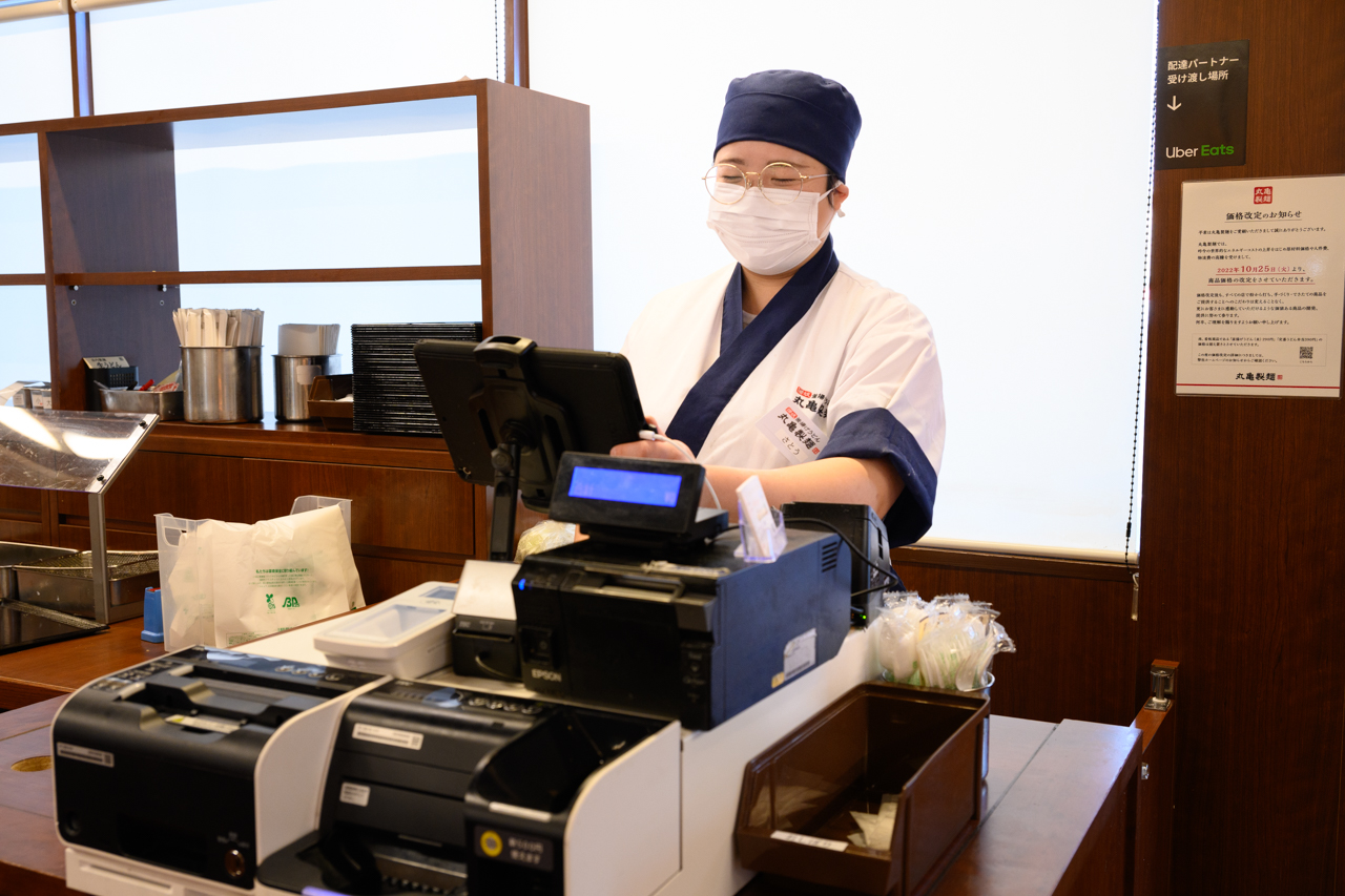ピーク時のスタッフは9人いて、麺職人、洗い場、ホール、厨房では天ぷらやおむすび担当など各部門に1人ずつ入っています。以前のレジはスタッフによって得手不得手があり、得意な人がレジに入ることが多かったのですが、今のレジは誰でも簡単に操作できるため、混雑時には厨房スタッフも積極的にレジに入ります。2台のレジがフルでスピーディーに活用できるようになり、お客様の待ち時間が明らかに激減しました。