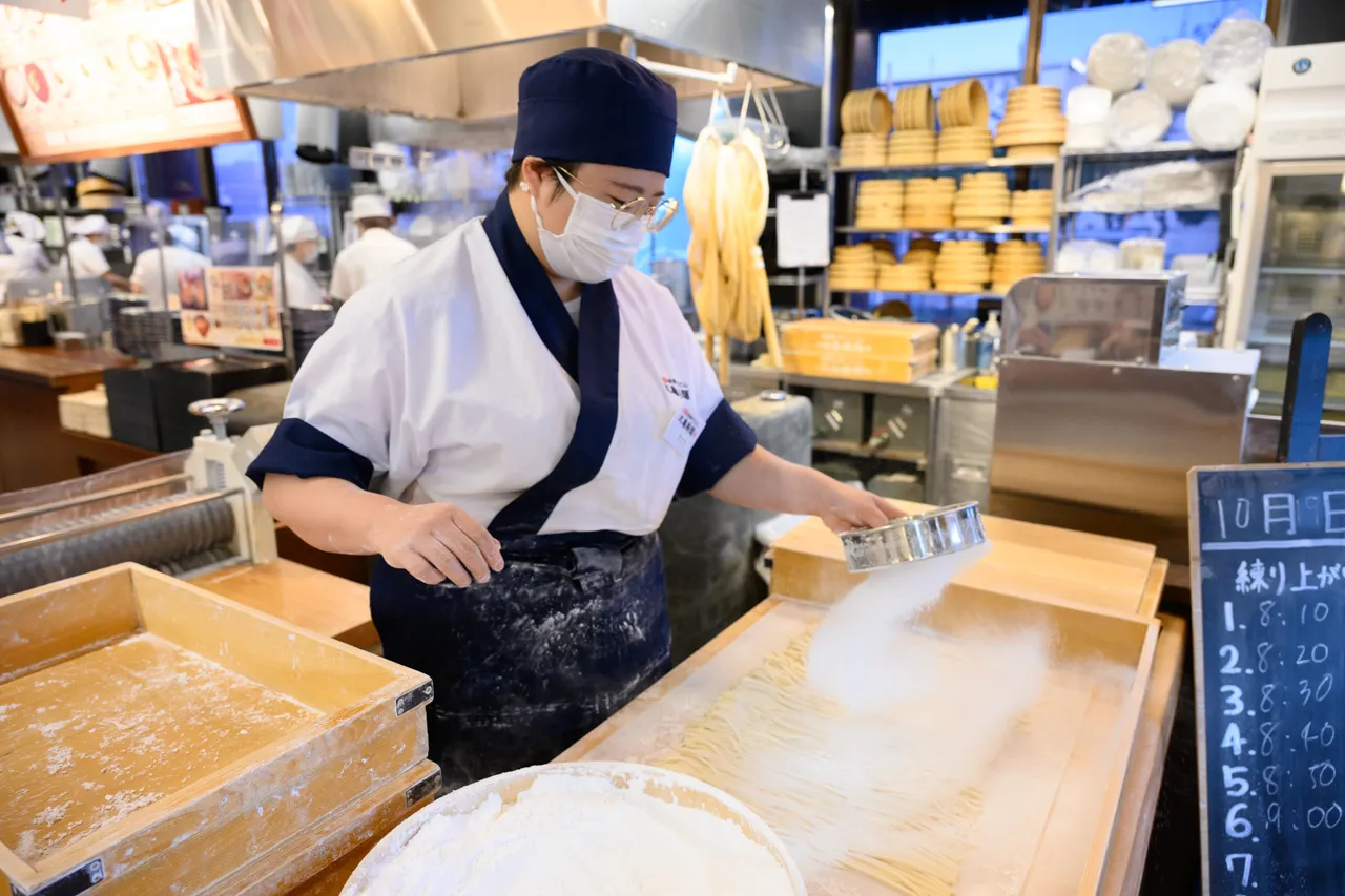 西神戸店では店内に生地を熟成するための大きな熟成庫があり、レーン手前では手打ち職人が生地を打ち、ローラーで引き伸ばし、切り出し機からうどんを切る様子まで見られるようになっています。うどんを粉から作る過程を一通り見ることができ、“うどんのテーマパーク”的な面白さも味わえます。家族連れのお客様も多いため、お子さまがうどんの製造過程を興味深く観察していたり、麺職人と会話を交わしたり。ただ食べるだけではない、プラスアルファの楽しさも味わってもらえたら嬉しいですね。