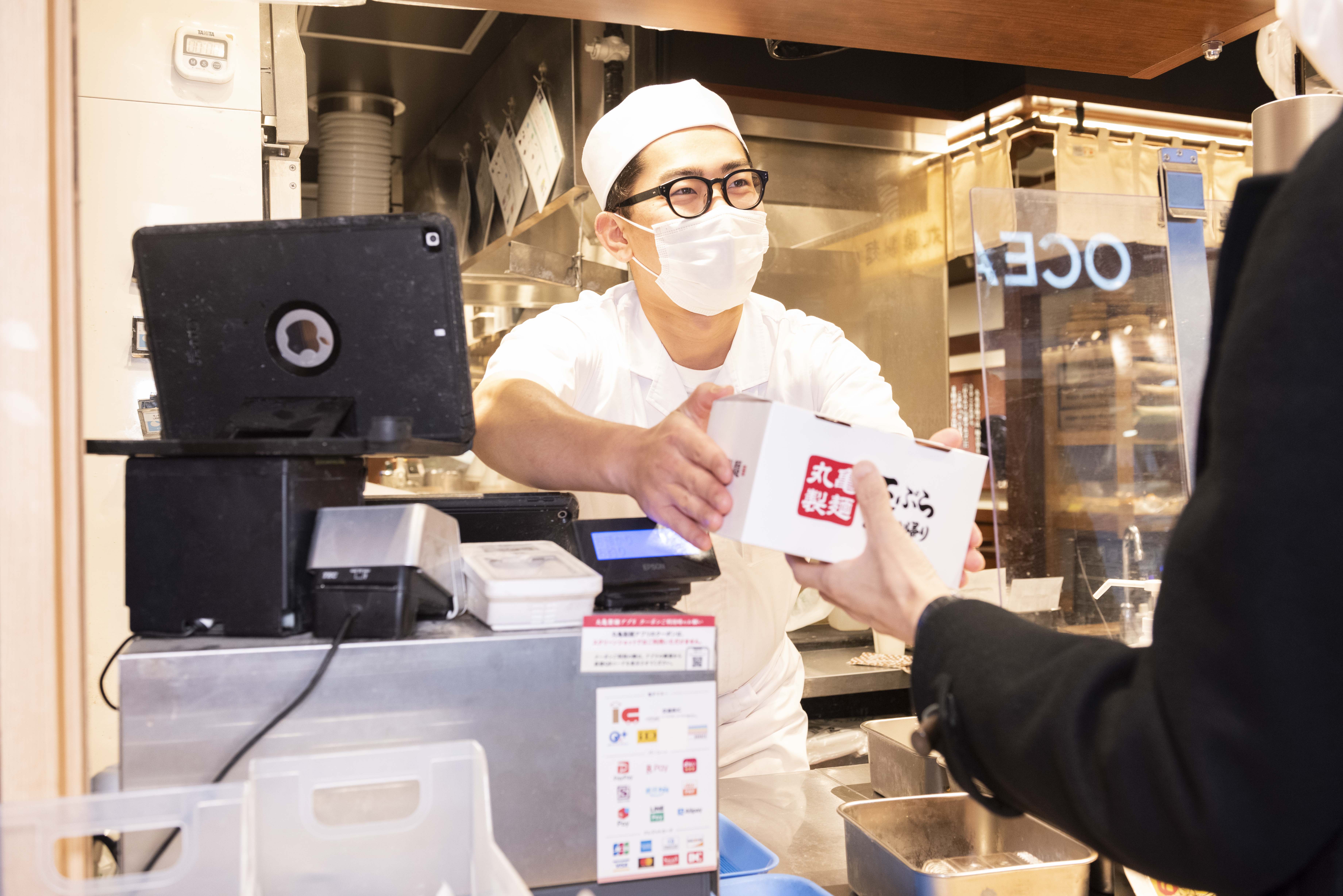 丸亀製麺ではコロナ禍の影響を受け、テイクアウトやデリバリーの取り組みを積極化し、2020年5月から全店でうどんのテイクアウトを開始しています。お店によってはテイクアウト専用の窓口を用意したり、モバイルオーダー、フードデリバリーサービスを実施したりと新たな販売チャネルへの取り組みを強化しています。