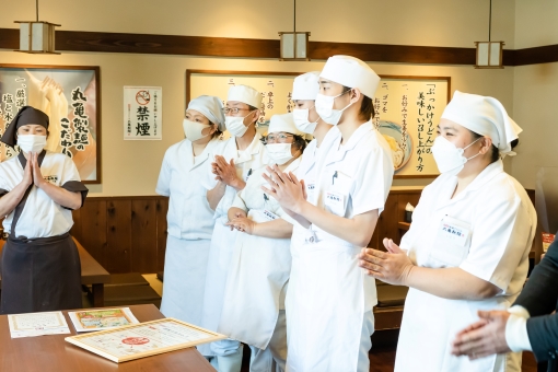 丸亀製麺では、食品ロス削減と「できたて」を両立する仕組みとして、「茹で麺管理表」を全店で導入しています。今回は、日々取り組む800以上の店舗の中から、特に功績を残した5店の表彰を行いました。