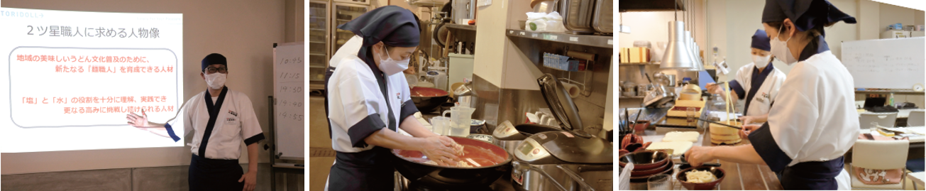 麺職人制度、天ぷら職人制度は、それぞれ書面による事前テストの他、様々な条件に合格したのち、さらに、実技・書面試験に合格した従業員に与えられる社内資格制度です。また、複数のキャリアを応援するという方針から、「麺職人の等級制度」を新たに創設しました。上記の資格試験に合格し、等級が上がれば、うどんの配合や茹で時間について職人がマニュアル外の裁量を持つことも可能です。合格率は三割程度と両制度ともに狭き門となっており、これらの制度の合格者は「麺職人」、「天ぷら職人」として認定され、活躍しています。