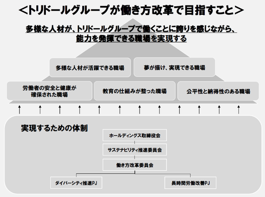 従業員にとって働きやすさや働きがいが向上し、個々の能力が発揮できる職場を実現することに より、持続的に成長していく会社の実現を図っています。