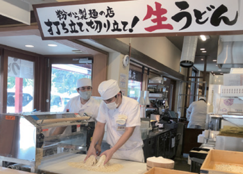 トリドールグループでは、お客さまに食を通じた感動を体験いただくことを大事にしています。そのため、丸亀製麺では1店舗1店舗粉から製麺を行っていますが、その臨場感を一層お客さまに感じていただけるように、麺を切るコンベアカッターの開発を行いました。