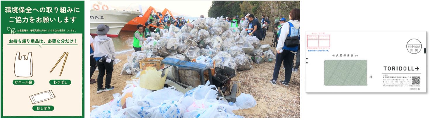 トリドールでは2023年11月、丸亀市の離島・讃岐広島にて海洋プラスチックを含む海洋ごみを回収する清掃活動を実施しました。人の立ち入りが難しい海岸へ特殊船にて出航し、合計約130名で約1トンの海洋ごみを回収しました。