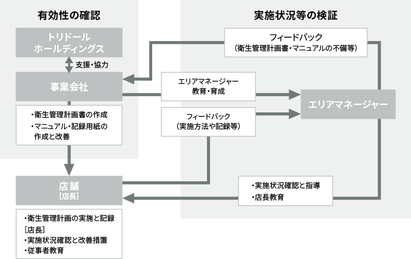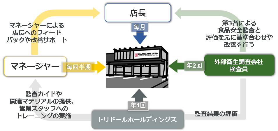 トリドールホールディングスは各事業会社に対して支援・協力を実施し、食品安全に必要な文書や記録作成を行います。また、事業会社はエリアマネージャーが中心となって店舗での運用を指導・管理します。
