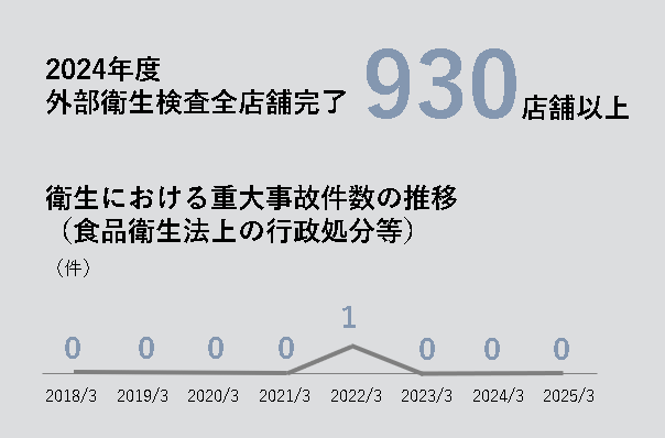 衛生管理に関しては、食品安全部による巡回指導に加え、当社グループとは独立した外部衛生検査機関による年2回の全店舗衛生監査を行うなど、衛生管理の徹底と維持向上に努めています。