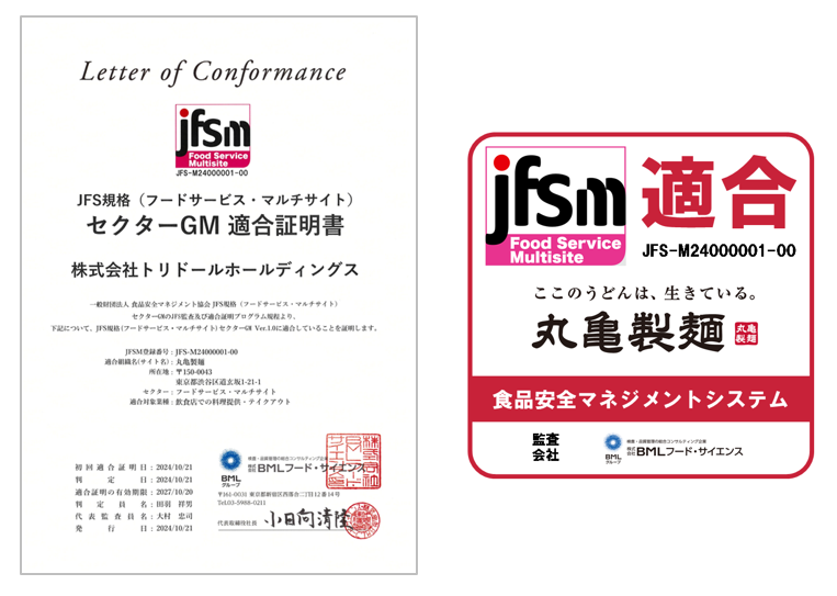 丸亀製麺は2024年10月21日、一般財団法人食品安全マネジメント協会における食品安全マネジメントシステムである JFS 規格(フードサービス・マルチサイト)の適合証明を国内外食チェーン店では初めて取得しました。