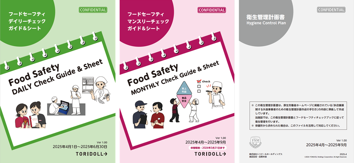 トリドールグループ は、国際的な衛生管理手法であるHACCAPの考え方に基づく管理を行い、衛生管理を確認・記録するためのフードセーフティチェックブックを2019年に導入しています。2020年4月には衛生管理計画書を策定し、全店での運用を開始しました。フードセーフティチェックブックと衛生計画書の実施と記録を通じて、日々の衛生確保はもちろんのこと、店舗や組織として改善改善の「見える化」ができる仕組みとしています。