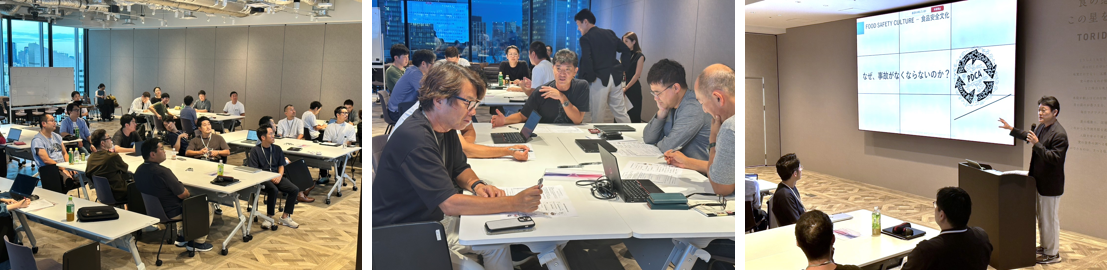 また、役職や職位に応じて、追加で求められる衛生知識や、店舗における管理・改善の手法に関する研修も実施しています。トリドールホールディングス代表取締役が先頭に立ち、役員並びにグループ各事業会社代表取締役ら経営トップが主体となり、社内にフードセーフティカルチャーを根付かせ、企業風土として定着させていきます。